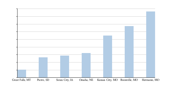 المدن | Great Falls, MT, Bismarck, ND, Pierre, SD, Sioux City, IA, Omaha, NE, Kansas City, KS, Kansas City, MO, St. Louis, MO |