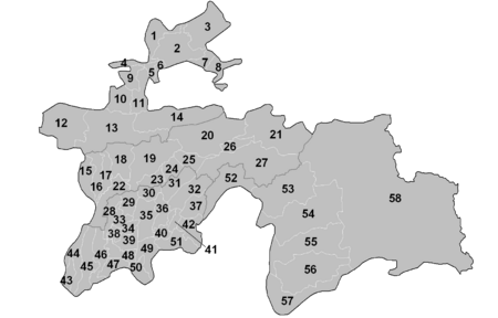 حتى 2020، كانت ولايات طاجيكستان مقسمة إلى 47 ناحية (بالطاجيكية: ноҳия، nohiya أو روسية: район، رايون) وهؤلاء لا يضمون 4 نواحي تابعة للعاصمة دوشانبه، و 18 مدينة تنتمي لولاية (منهم دوشانبه، المدينة العاصمة فوق الولاية).[1] Before ca. 2017, there were 58 districts.[2][3][4] The districts are further subdivided into municipal units: either as urban municipalities called either as cities (بالطاجيكية: шаҳр, "cities") or towns (بالطاجيكية: шаҳрак, "towns"), or as rural municipalities called jamoats (بالطاجيكية: ҷамоати деҳот, "village communes"), which in turn are further subdivided into villages (بالطاجيكية: деҳа or қишлоқ, "villages/hamlets").