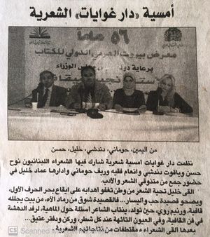 2- أمسية بعنوان "دار غوايات" الشعرية في معرض بيروت العربي الدولي للكتاب وقد نشرت في جريدة اللواء بتاريخ 15 كانون الأول 2012.