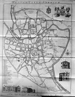 Amid this metropolitan culture, the city burghers had built a sophisticated political structure. Freemen, who had the right to trade and to vote at elections, numbered about 2,000 in 1690, rising to over 3,300 by the mid-1730s. With growth partly the result of political manipulation, their numbers did at one point reach one-third of the adult male population.[41] This was notoriously the age of "rotten" and "pocket" boroughs and Norwich was unusual in having such a high proportion of its citizens able to vote. "Of the political centres where the Jacobin propaganda had penetrated most deeply only Norwich and Nottingham had a franchise deep enough to allow radicals to make use of the electoral process."[47] "Apart from London, Norwich was probably still the largest of those boroughs which were democratically governed," says Jewson 1975, describing other towns under the control of a single fiefdom. In Norwich, he says, a powerful Anglican establishment, symbolised by the Cathedral and the great church of St Peter Mancroft was matched by scarcely less powerful congeries of Dissenters headed by the wealthy literate body [of Unitarians] worshipping at the Octagon Chapel.[48]