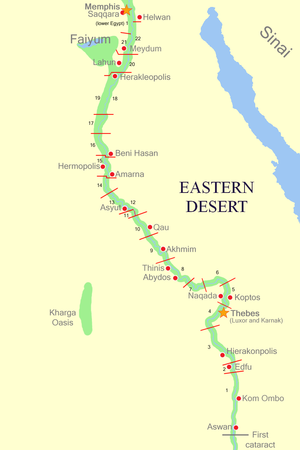 كانت مصر العليا تنقسم إلى 22 اقليم. كان الاقليم الأول مركزه على إلفنتين بالقرب من الحدود المصرية مع النوبة عند الشلال الأول- المنطقة التي تعرف اليوم باسم أسوان. من هناك كان عدد الأقاليم يزداد بتقدم النهر على امتداد شريط الأراضي الخصبة الضيق لوادي النيل. الواسطة (طيبة القديمة أو الأقصر المعاصرة) كانت تمثل الاقليم الرابع، العمارنة في الترتيب الرابع عشر، وميدوم في الترتيب الحادي والعشرين.