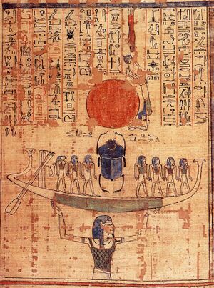 In the 12th Hour of the Book of Gates, Nu is depicted with upraised arms holding a solar bark (or barque, a boat). The boat is occupied by eight deities with Khepri, Ra's morning aspect, standing in the middle and being surrounded by the seven other deities.[بحاجة لمصدر]