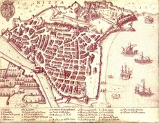 The maritime strength of Nice now rapidly increased until it was able to cope with the Barbary pirates; the fortifications were largely extended and the roads to the city improved.[11] In 1561 Emmanuel Philibert, Duke of Savoy abolished the use of Latin as an administrative language and established the Italian language as the official language of government affairs in Nice.