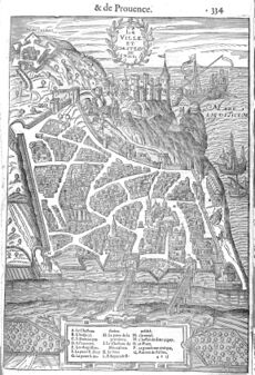 During the struggle between Francis I and Charles V great damage was caused by the passage of the armies invading Provence; pestilence and famine raged in the city for several years.[11] In 1538, in the nearby town of Villeneuve-Loubet, through the mediation of Pope Paul III, the two monarchs concluded a ten years' truce.[14]