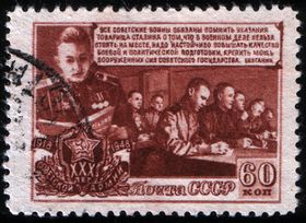 ![]() مأثورة من بولگانين على طابع بريدي من الاتحاد السوڤيتي ضمن سلسلة طوابع «الذكرى الثلاثون على تأسيس الجيش السوڤيتي»، 1948. |