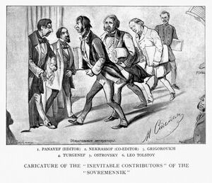 In 1854 Nekrasov invited Nikolai Chernyshevsky to join Sovremennik, in 1858 Nikolai Dobrolyubov became one of its major contributors. This led to the inevitable radicalisation of the magazine and the rift with its liberal flank. In 1859 Dobrolyubov's negative review outraged Turgenev and led to his departure from Sovremennik.[11] But the influx of young radical authors continued: Nikolai Uspensky, Fyodor Reshetnikov, Nikolai Pomyalovsky, Vasily Sleptsov, Pyotr Yakubovich, Pavel Yakushkin, Gleb Uspensky soon entered the Russian literary scene.[4] In 1858 Nekrasov and Dobrolyubov founded Svistok (Whistle), a satirical supplement to Sovremennik. The first two issues (in 1859) were compiled by Dobrolyubov, from the third (October 1858) onwards Nekrasov became this publication's editor and regular contributor.[15]