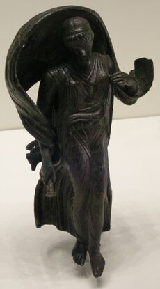 More often, Nyx was worshipped in the background of other cults. Thus there was a statue called "Night" in the Temple of Artemis at Ephesus.[14] The Spartans had a cult of Sleep and Death, conceived of as twins.[15] Cult titles composed of compounds of nyx- are attested for several deities, most notably Dionysus Nyktelios "nocturnal"[16] and Aphrodite Philopannyx "who loves the whole night".[17]