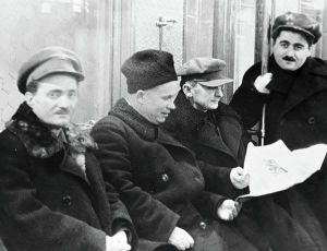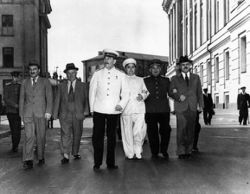 ستالين (وسط، بجاكت أبيض وسروال داكن) يمشي مع أعضاء الپوليتبيرو، بما فيها خروشوڤ إلى يساره.