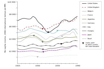 The Great Depression in the 1930s, which severely decreased economic output throughout the world and produced high unemployment and widespread poverty, was widely regarded as a failure of economic liberalism.[60] To renew the damaged ideology, a group of 25 liberal intellectuals, including a number of prominent academics and journalists like Walter Lippmann, Friedrich Hayek, Ludwig von Mises, Wilhelm Röpke, Alexander Rüstow, and Louis Rougier, organized the Walter Lippmann Colloquium, named in honor of Lippman to celebrate the publication of the French translation of Lippmann’s pro-market book An Inquiry into the Principles of the Good Society.[61][62] Meeting in Paris in August 1938, they called for a new liberal project, with "neoliberalism" one name floated for the fledgling movement.[63] They further agreed to develop the Colloquium into a permanent think tank based in Paris called the Centre International d'Études pour la Rénovation du Libéralisme.[64]