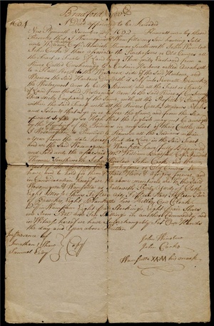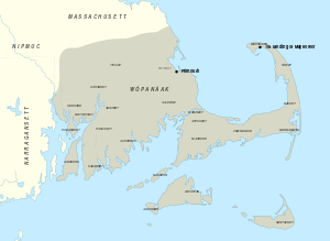 In 1652, English colonists purchased Old Dartmouth—a region of 115،000 acre (470 km2) that is now Dartmouth, Acushnet, New Bedford, Fairhaven, and Westport—in a treaty between the Wampanoag, represented by Chief Ousamequin (Massasoit) and his son Wamsutta, and John Winslow, William Bradford, Myles Standish, Thomas Southworth, and John Cooke.[10][9] While the Europeans considered themselves full owners of the land through the transaction, the Wampanoag have disputed this claim because the concept of land ownership—in contrast with hunting, fishing, and farming rights—was a foreign concept to them.[9]