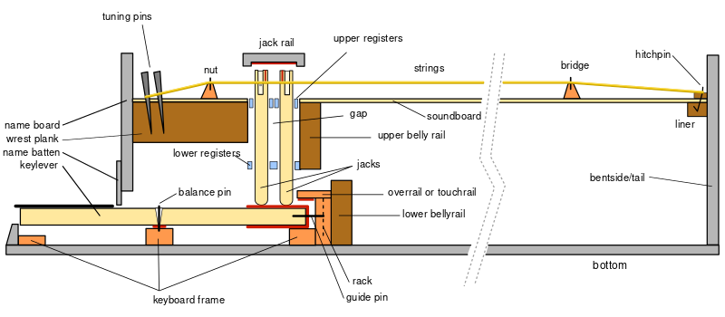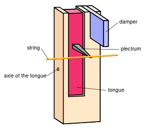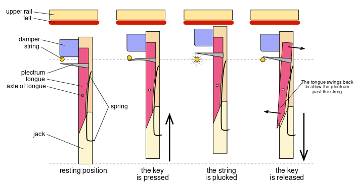 • When the key is released, the jack falls back down under its own weight, and the plectrum passes back under the string. This is made possible by having the plectrum held in a tongue attached with a pivot and a spring to the body of the jack. The bottom surface of the plectrum is cut at a slant; thus when the descending plectrum touches the string from above, the angled lower surface provides enough force to push the tongue backward.[6]