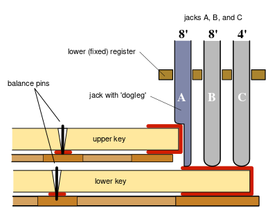 The English "dogleg" jack system (also used in Baroque Flanders) does not require a coupler. The jacks labeled A in Figure 5 have a "dogleg" shape that permits either keyboard to play A. If the player wishes to play the upper 8' from the upper manual only and not from the lower manual, a stop handle disengages the jacks labeled A and engages instead an alternative row of jacks called "lute stop" (not shown in the Figure). A lute stop is used to imitate the gentle sound of a plucked lute.[7]