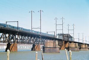 Two railroad mainlines pass through Havre de Grace. More than 80 daily passenger trains on Amtrak's busy Northeast Corridor speed through the city at 90 أميال في الساعة (145 km/h) on an elevated line connected to the adjacent Amtrak Susquehanna River Bridge.[30] The double-track bridge was built by the Pennsylvania Railroad between 1904 and 1906 for its New York City–Washington, D.C. line. (The bridge replaced a wooden single-track railroad bridge, completed in 1866 by the Philadelphia, Wilmington, and Baltimore Railroad, whose piers can still be seen from the city's David R. Craig Park.) The Philadelphia Subdivision of CSX Transportation, originally built by the Baltimore and Ohio Railroad, carries a heavy volume of freight across the river on the CSX Susquehanna River Bridge, rebuilt between 1907 and 1910, about 1 ميل (1.6 km) upstream of the Amtrak bridge.[30]