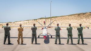 طيارو مسيرات من البلدان الخمس المشاركة في تدريبات بلو گارديان أمام المسيرة الإسرائيلية هرميس 450، 12 يوليو 2021.