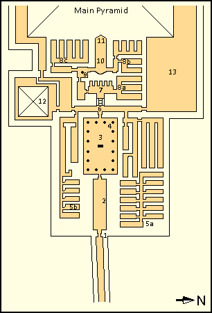 مخطط معبد أوناس الجنائزي. بالترتيب: (1) مدخل جرانيت بناه تيتي؛ (2) قاعة المدخل به غرف تخزين (5 أ وب) في الشمال والجنوب؛ (3) باحة بها (4) ثمانية عشر عموداً جرانيتياً؛ (6) ممر عرضي؛ (7) مصلى بخمسة مشكيات تمثايل؛ (8 أ، ب، ج) غرف تخزين للمعبد الداخلي؛ (9) غرفة انتظار مربعة بعمود مركزي؛ (1) قاعة القرابين و(11) باباً زائفاً يحمل نقشاً للحماية؛ (12) هرم العبادة؛ و(13) باحة محيطة بمجمع الهرم.