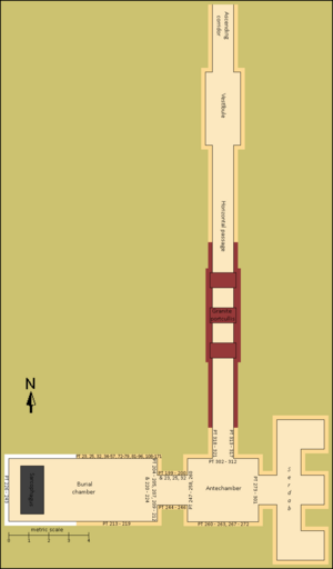 4. ^ In Unas's pyramid, only the south sections of the horizontal passage was inscribed.[99][37] Teti's pyramid received the same treatment, though the pyramids of Merenre and Pepi II had writings throughout the entire horizontal passage and the vestibule with the three granite portcullises, and Pepi I's pyramid also had writings on a section of the ascending corridor as well.[99]