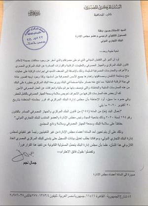 رسالة موجهة من البنك المركزي إلى البنك التجاري الدولي حول مخالفات في البنك وإقالة هشام عز العرب، 22 أكتوبر 2020.