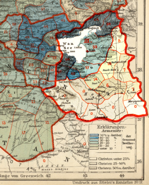 The checkered Christian districts southeast of Lake Van is where the Assyrians of Hakkari lived, while the Christian districts in Blue designate where Armenians lived