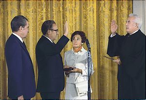 كيسنجر يؤدي اليمين كوزير للخارجية أمام كبير القضاة وارن برگر، 22 سبتمبر 1973. والدة كيسنجر، پولا، تحمل الكتاب المقدس والذي أدى عليه كيسنجر اليمين في الوقت الذي الرئيس نيكسون متابعاً.