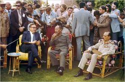 الفريق عبد الغني الجمسي، أنور السادات، هنري كيسنجر، في مؤتمر صحفي مباغت في استراحة المعمورة، الإسكندرية.