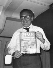 على متن إير فورس ون، كيسنجر يعبر عن سعادته باختياره "رجل العام" في مجلة تايم، مع الرئيس ريتشارد نيكسون، في 1972.