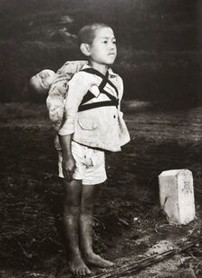 The Boy Standing by the Crematory, a historic photograph taken in Nagasaki, Japan, in September 1945, shortly after the atomic bombing of that city on August 9, 1945. The photograph is of a boy of about 10-years-old with his dead baby brother strapped to his back, waiting for his turn at the crematorium.