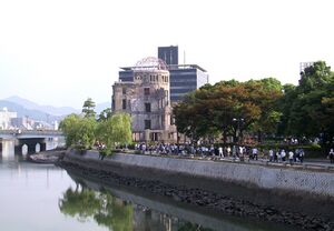 Citizens of Hiroshima walk by the Hiroshima Peace Memorial, the closest building to Ground Zero not to have collapsed from "Little Boy".