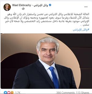 11. ^ "فيديوجراف.. مش طبيعي.. تطورات جديدة في حالة الإعلامي وائل الإبراشي". صدى البلد. 2021-08-09. Retrieved 2021-08-09.