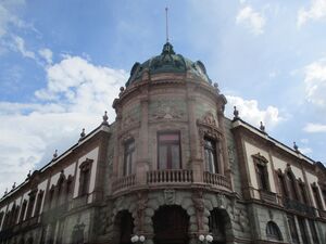 Teatro Macedonio Alcalá is a working theatre and also houses a collection of romantic art.[4] Built between 1903 and 1909, it was originally named the Luis Mier y Terán Theater. The design is typical of the Porfirio Díaz period ending the 19th century and beginning the 20th. It was later renamed the Jesús Carranza Theater. The current name dates back to 1932, honoring the composer of the state anthem "Dios Nunca Muere" (God Never Dies).[19] The theatre has three parts: the vestibule, the main hall and the stage. The main entrance is on the corner. On the Armenta and López Street sides, the lower level is occupied by shops and by the Miguel Cabrera Salon, which hosts art exhibits. The vestibule is Louis XV style with a white marble staircase and the main hall is in "Imperial" style, in which the anthropomorphic columns stand out.[2]