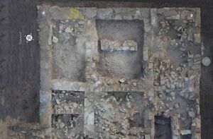 وتشير الدراسات المبدئية على المبنى إلى أنه وقت تشييد المبنى كان يتكون من طابقين؛ الأول به صالتين وغرفتين وحمام ومطبخ، بالإضافة إلى سلم يؤدي إلى الطابق الثاني. وفي منتصف بعض الغرف داخل الطابق الأول عثرت البعثة على عدد من قواعد لأعمدة، ما يشير إلى أنها كانت تستخدم لتثبيت وحمل السقف. وتشير الدلائل الأثرية والعلمية إلى أن المبنى جرى استغلاله في العصر الروماني، وجرى تنفيذ بعض التعديلات الداخلية على المبنى من عمل مدخل له من الجهة الشمال وإضافة جدران فاصلة بين الصالات، واستخدام بعض الغرف كورش لصهر النحاس.