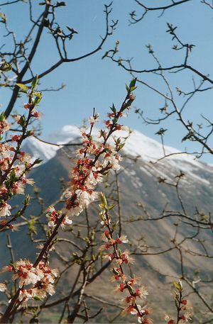 The local languages spoken include Burushaski, Wakhi and Shina. The literacy rate of the Hunza valley is more than 95%. The establishment of community schools that provide high quality education, and the influence of the Aga Khan Mirs, contributing towards building universities for higher education have directed towards the high literacy rate in Hunza Valley, especially for girls.[22] The historical area of Hunza and present northern Pakistan has had, over the centuries, mass migrations, conflicts and resettling of tribes and ethnicities, of which the Shina people are the most prominent in regional history. People of the region have recounted their historical traditions down the generations. The Hunza Valley is also home to some Wakhi, who migrated there from northeastern Afghanistan beginning in the nineteenth century onwards.[23] The majority of residents in Hunza belong to the Ismaili Shia sect. They believe that Aga Khan V is their religious figurehead and transcendent. He is also believed to be the biggest promotor and contributor towards the literacy success and overall well-being of the people of Hunza and the valley itself.[21]
