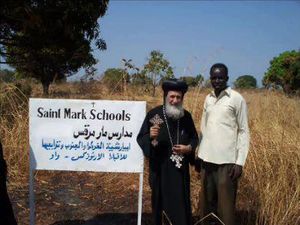 الأنبا إيليا أسقف الخرطوم وجنوب السودان، أمام مدارس مار مرقس القبطية في واو.