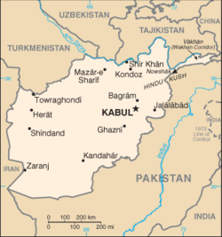 {{Location map+ | Afghanistan | AlternativeMap = Afghanistan physical map.svg | width = 200 | caption = موقعان في أفغانستان | places = {{Location map~ | Afghanistan | lat_deg = 34.53 | lon_deg = 69.16 | label = كابول }} {{Location map~ | Afghanistan | lat_deg = 31.62 | lon_deg = 65.72 | label = قندهار }} }}