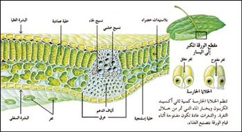 ثاني أكسيد الكربون يدخل إلى الورقة من الهواء الخارجي. وللبشرة مسام صغيرة عديدة. وهذه المسام، التي تسمى الـثـغـور تمكِّن ثاني أكسيد الكربون من الدخول إلى الورقة. ويحاط كل واحد منها بخليتين حارستين مقوستين في شكل بذرة الفاصوليا بإمكانها الانتفاخ والارتخاء. وعندما تنتفخ هذه الخلايا يفتح الثغر فتحة واسعة ويدخل ثاني أكسيد الكربون إلى الورقة، وعندما ترتخي الخلايا الحارسة ينغلق الثغر. وتفتح الثغور في معظم النباتات أثناء النهار وتغلق خلال الليل.
