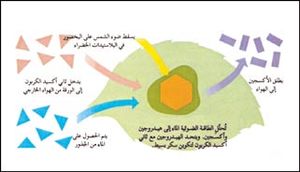 داخل الورقة الخضراء يوضح هذا المقطع العرضي التركيبات العديدة لنصل الورقة. تعمل الخلايا العمادية والخلايا الإسفنجية مصانع منتجة للغذاء. ويختص النسيج الخشبي في العروق بتوزيع الماء بينما يقوم نسيج اللحاء بحمل الغذاء من الورقة إلى أجزاء النبات الأخرى. أما الثغرات أو المسامّ الموجودة على السطح السفلي للنصل فتمكن الغازات من الدخول إلى الورقة والخروج منها. تعد الورقة الخضراء مصنعًا رائعًا لتصنيع الغذاء. فهي تقوم بتحويل مواد بسيطة إلى غذاء غني بالطاقة باستعمال الطاقة الشمسية فقط. ويصف هذا القسم كيفية حصول الورقة على المواد الخام المطلوبة لتصنيع الغذاء، ثم يقدم شرحًا بسيطًا للطريقة التي تصنع بها الورقة الغذاء في عملية التركيب الضوئي. وأخيرًا يناقش هذا القسم عملية النتح وهي عملية فقد الماء التي تؤدي دورًا أساسيًا في صنع الغذاء في الورقة