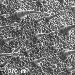 - أو قد تفرز مادة لزجة، أو نلاحظ أشعار جافة كما في نبات أذن الدب لتحميه من الرعي، ولهذه الشعيرات وظيفة الإقلال من سرعة الهواء فتبطئ من معدل فقدان الماء وتعكس الشمس.