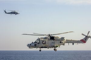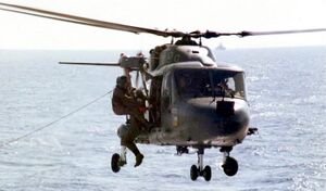 The Navy's Lynx helicopters were among Britain's contribution to the coalition against Saddam Hussein's Iraq during the 1991 Gulf War. During the Battle of Bubiyan, the biggest naval engagement of the conflict, the Lynx and its Sea Skua missiles proved to be decisive, being responsible for the majority of individual engagements with various Iraqi Navy vessels.[56] By 2 February 1991, 25 Sea Skuas had been launched, out of these, 18 were confirmed as having hit their targets, and had succeeding in heavily damaging a significant portion of Iraq's navy.[57][58] Navy Lynxes were routinely used to deploy troops to oil platforms and into occupied Kuwait, as well as to perform aerial reconnaissance across the Gulf.[59]