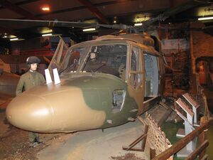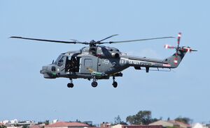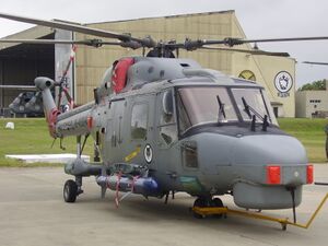 Many of the Lynx's components had been derived from earlier Westland helicopters such as the Scout and Wasp.[18] The Lynx has been substantially upgraded since entering service in the 1970s; improvements made to in-service aircraft have typically included strengthened airframes, new avionics and engines, improved rotor blades, and additional surveillance and communications systems.[25][43] Various subsystems from overseas suppliers have been incorporated into some Lynx variants; during a South Korean procurement, hulls produced in the United Kingdom were equipped with Korean-built systems, such as ISTAR, electro-optical, electronic warfare, fire-control systems,[46][47] flight control actuators,[48] and undercarriages.[49] A glass cockpit was adopted on the Super Lynx 300, featuring fully integrated flight and mission display systems, a variety of integrated display units including head-up displays, and dual controls; AgustaWestland has commented that the new cockpit reduces aircrew workload and increases aircraft effectiveness.[36][38] The head-up display installed could be replaced by a helmet-mounted sight system on customer demand.[45]