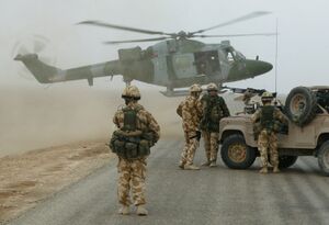In March 2003, the Lynx formed the bulk of the deployed British rotary aviation battle group in the invasion of Iraq. Participating aircraft were quickly outfitted with engine sand filters, armour, heat dissipaters, modern secure radios and radar warning receivers.[68] In the subsequent multi-national occupation force, a flight of either AAC or CHF Lynx AH.7s were based at Basra International Airport under command of the Joint Helicopter Force (Iraq) on a rotational basis.[69][70] In theatre, they would escort infantry patrols, perform aerial reconnaissance, provide fire support and act as airborne communications hubs. Problems in operating in the high temperature environment were encountered, with the helicopters often operating with no power reserve and thus without the ability to overshoot during landings; these problems were belatedly overcome by the introduction of the Lynx AH.9A.[71]