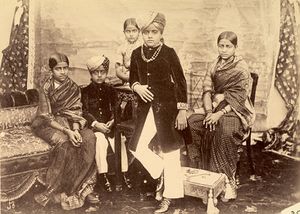An 1895 group photograph of the eleven-year-old Krishnaraja Wadiyar IV, ruler of the princely state of Mysore in South India, with his brothers and sisters. In 1799, his grandfather, then aged five, had been granted dominion of Mysore by the British and forced into a subsidiary alliance. The British later directly governed the state between 1831 and 1881.