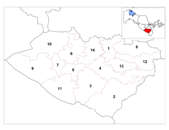 The Qashqadaryo Region consists of 13 districts (listed below) and two district-level cities: Qarshi and Shahrisabz.[1][4]