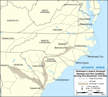 خريطة حملات شرمان في جورجيا والكاروليناتين، 1864–1865