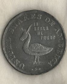 "UNITED SNAKES OF AMERICA" "IN BRYAN WE TRUST" political satire token of 1896, known as "Bryan Money"