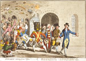 في نوفمبر 1783 قدم تشارلز جيمس فوكس للبرلمان، بوصفه وزير دولة للشئون الخارجية في الوزارة الائتلافية، "مشروع قانون لإصلاح الهند "لو ووفق عليه لوضع شركة الهند الشرقية تحت هيمنة مندوبين تعينهم الوزارة. وعلت شكوى النقاد بأن القانون سيتيح للأعضاء الأحرار (الهويجز) أمثال فوكس وبيرك معيناً من الغنائم تأتيهم بها هذه الرعاية. ومر القانون من مجلس العموم، ولكن الملك أرسل إلى مجلس اللوردات يقول أنه سيعد أي رجل يصوت للمشروع عدواً له، فصوتوا ضده بأغلبية 95 إلى 76. وأودع نواب العموم احتجاجاً رسمياً يقرر أن هذا التدخل الملكي في التشريع عدوان صارخ على حق أعضاء البرلمان. وأقال الملك الوزارة الائتلافية (18 ديسمبر 1783) مدعياً أنها فقدت ثقة البرلمان، ودعا وليم بت، الذي كان في الرابعة والعشرين، لتأليف حكومة جديدة. وحل جورج الثالث البرلمان معتقداً أن في استطاعته الفوز في انتخاب قومي (23 مارس 1784) وأمر عملاءه ببث الرغبات والعطايا الملكية بين الناخبين ضماناً لعودة أغلبية محافظة. وجاء البرلمان الذي التأم شمله في 18 مايو مؤيداً لبت والملك تأييداً ساحقاً.