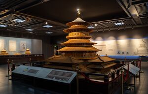- ^ 《资治通鉴·唐纪·唐纪二十》:辛亥,明堂成,高二百九十四尺,方三百尺。凡三层:下层法四时,各随方色。中层法十二辰;上为圆盖,九龙捧之。上层法二十四气;亦为圆盖,上施铁凤,高一丈,饰以黄金。中有巨木十围,上下通贯,栭栌棤藉以为本。下施铁渠,为辟雍之象。号曰万象神宫。
