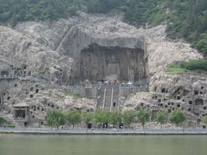 Wu Zetian became a very active supporter of Buddhism. Furthermore, she claimed to be an incarnation of Maitreya, writing a document called the Great Cloud Sutra, which prophesied that a female emperor would eradicate illness, worry and disaster from the world. She sought the support of the Buddhist clergy to this end. In 673 Wu provided 20,000 cash for a gigantic statue of Maitreya at Longmen Grottoes.[5] Unlike her predecessor's dynasty, Wu Zetian selected people in her government based on their skills, and not on their status. The Buddhist clergy created a document called Commentary on the Meaning of the Prophecy about Shenhuang, which predicted a female Chakravartin who would rule the Jambudvipa as the reincarnation of Vimalaprabha. This document was presented to Wu Zetian two months before the proclamation of the Zhou Dynasty.