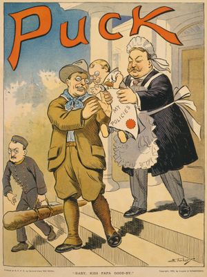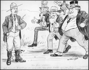 Roosevelt introduces Taft as his crown prince: Puck magazine cover cartoon, 1906.