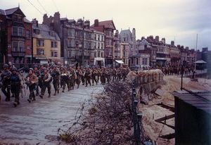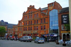 The modern town of Weymouth originated as the two settlements of Weymouth and Melcombe Regis, on opposite sides of Weymouth Harbour in Dorset. The older of the two, on the south side, was referred to as Weymouth as early as the 10th century, as part of the parish of Wyke Regis, and by 1252 had become a chartered borough and established seaport, trading in imported wine. Melcombe Regis, on the north side, was first noted in the 11th century. It developed separately from the mid 12th century onwards and in 1310 was a licensed wool port.[2][3] However, French raiders found the port so accessible that in 1433 the staple was transferred to Poole.[4] Melcombe Regis is thought to be the first port at which the Black Death came into England in June or July 1348, possibly aboard either a spice ship or an army ship from Calais, where fighting was taking place in the Hundred Years' War.[5][6]