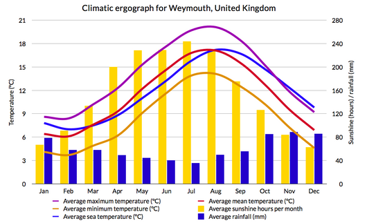 Source: 1991–2020 averages for Wyke Regis climate station. Sources: Met Office[21] and Cefas[23] |