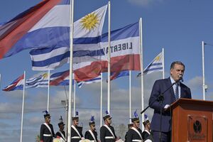 Orsi giving a speech at a ceremony commemorating the Battle of Las Piedras; 18 May 2023.